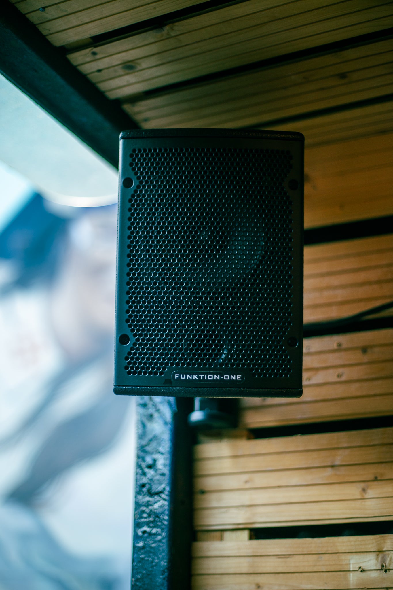 The record store is fitted with four Funktion One speakers in each corner and a Funktion One subwoofer. Two of the speakers and the subwoofer can be rotated to point outwards towards the listening audiance.
